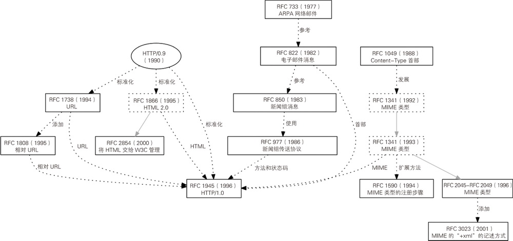 在 RFC 确定之前,Web 浏览器和 Web 服务器的功能要通过多个软件来实现,之后在 RFC 中实现标准化,最初的体系就是这样的。欧洲核子研究组织(European Organization for Nuclear Research,CERN)的在籍人员蒂姆·伯纳斯·李(Tim Berners-Lee)在 1990 年的圣诞节假期开发了最早的 Web 服务器 CERN HTTPd。1993 年,伊利诺伊大学的美国国家超级计算应用中心(National Center for Supercomputer Applications,NCSA)的罗伯特·麦克库尔(Robert Mccool)开发了 Apache 的前身 NCSA HTTPd,马克·安德森(Marc Andreessen)开发了浏览器的始祖 NCSA Mosaic3。安德森等在 1994 年创立了 Netscape。Netscape 开发的 JavaScript 和 SSL(Secure Sockets Layer,安全套接层)等技术后来实现了标准化。